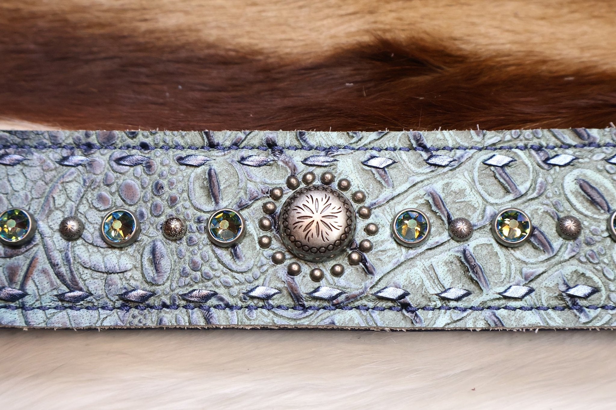 Aurora Borealis Swarovski Crystals, silver-toned studs on faded denim blue, crocodile embossed leather with zinc hardware.