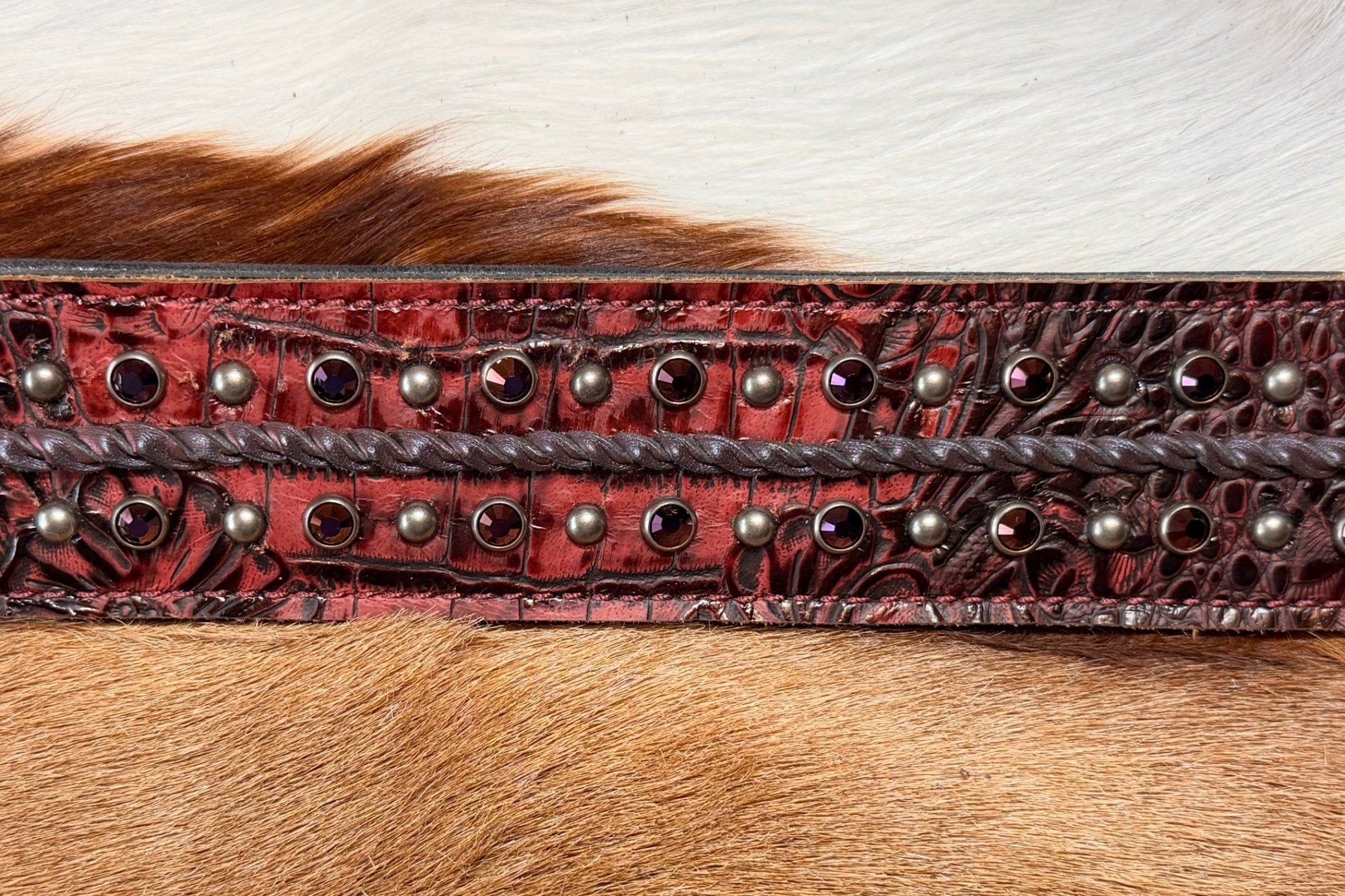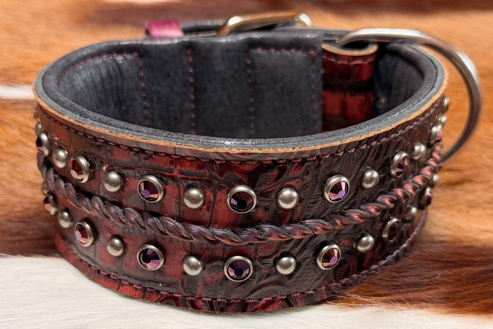 Deep red Swarovski Crystals and silver-toned studs on red, crocodile embossed leather with zinc hardware.