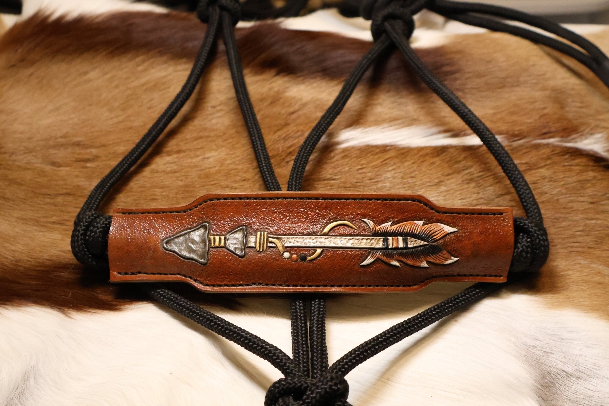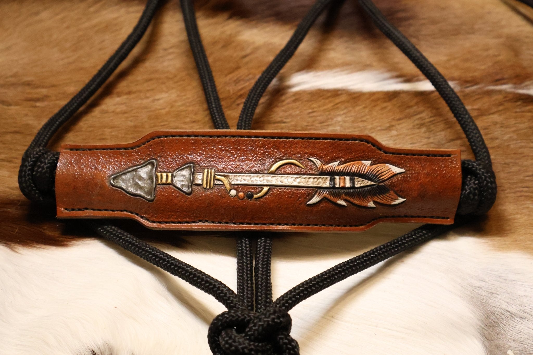 One-of-a-kind, hand-tooled leather noeseband featuring an intricate arrow and feather design, set on a classic black rope halter. Crafted from rich, warm-toned Hermann Oak leather and finished by hand, this piece blends timeless Western symbolism with artisan craftsmanship.