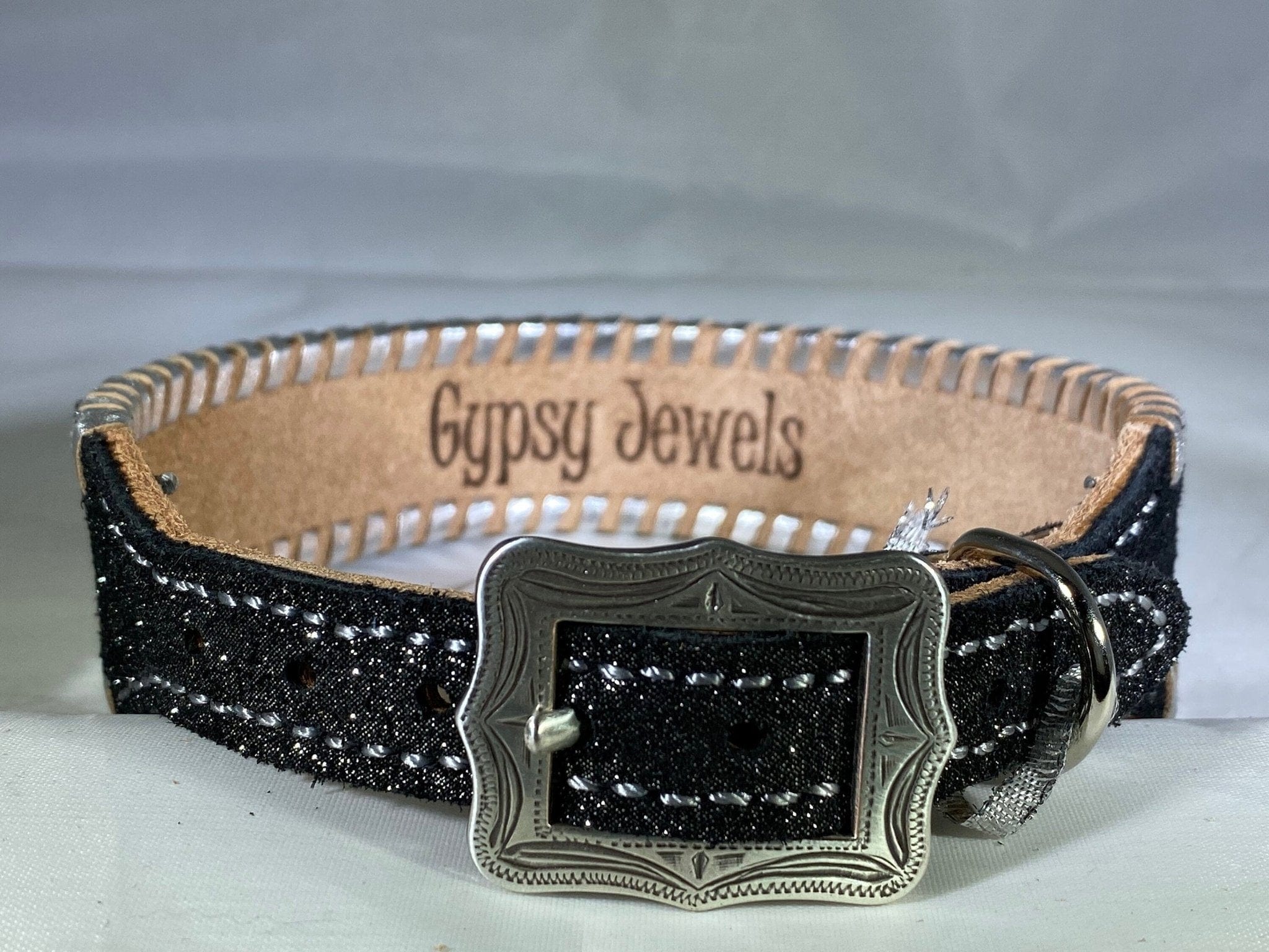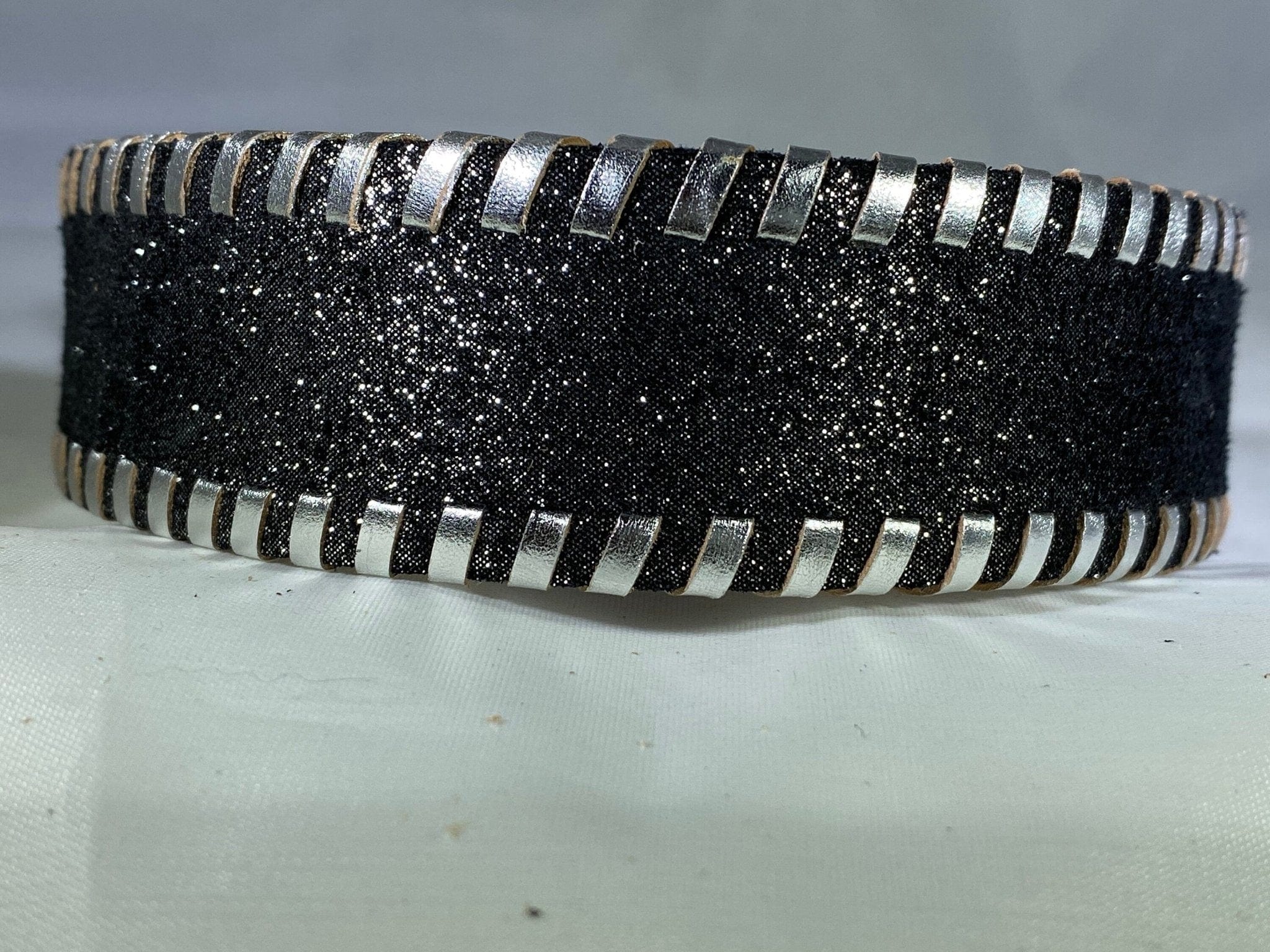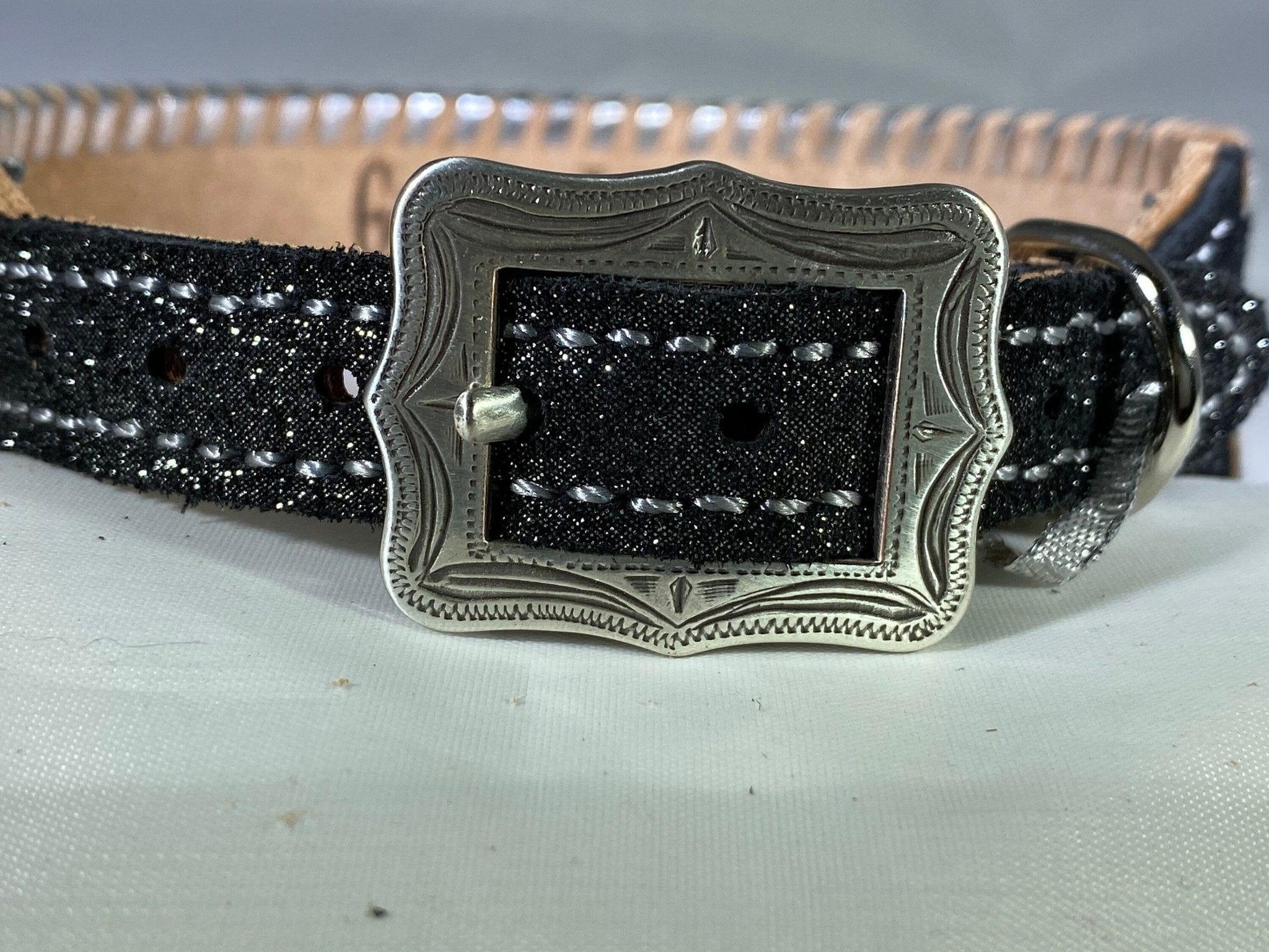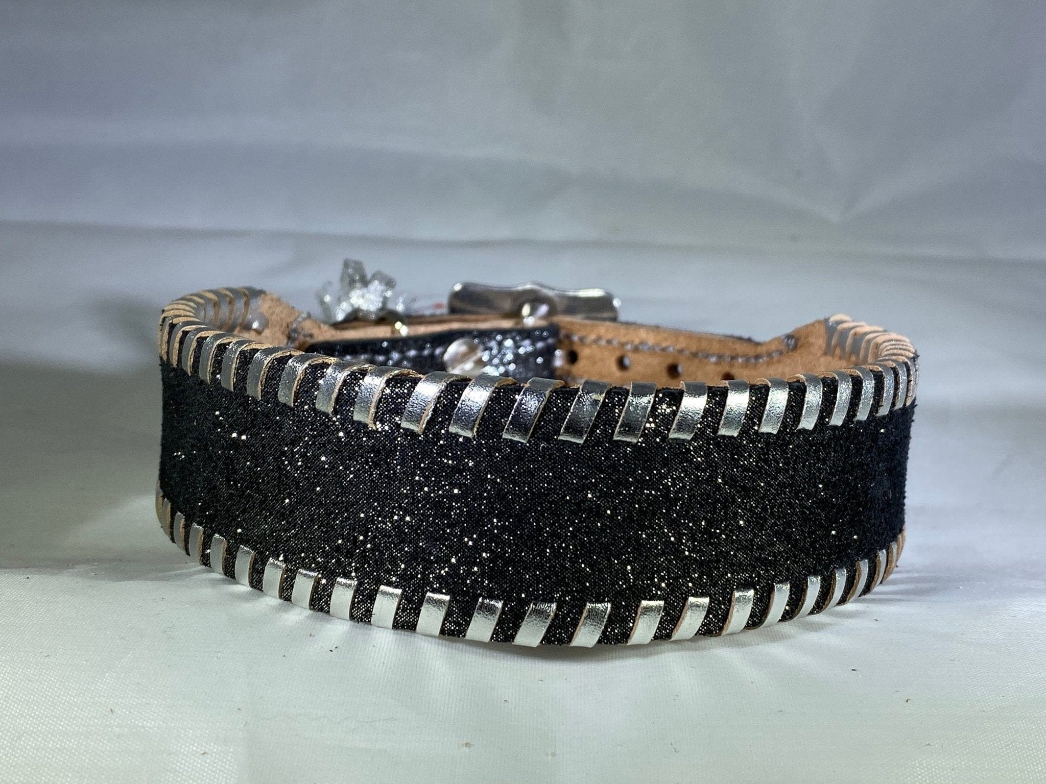This Get your SHINE ON in this black sparkly dog collar! is a masterpiece of sparkle and sophistication, crafted from luxurious black ultra suede leather that feels as good as it looks. Get your SHINE ON in this black sparkly dog collar is adorned with shimmering metallic silver kangaroo whip stitching, adding an extra level of chic that gleams under the light. the black suede is speckled with a subtle glitter, reminiscent of a star-studded nigh sky. This Get your SHINE ON in this black sparkly dog collar doesn't just promise elegance; it delivers durability and comfort for your pup's daily adventures.