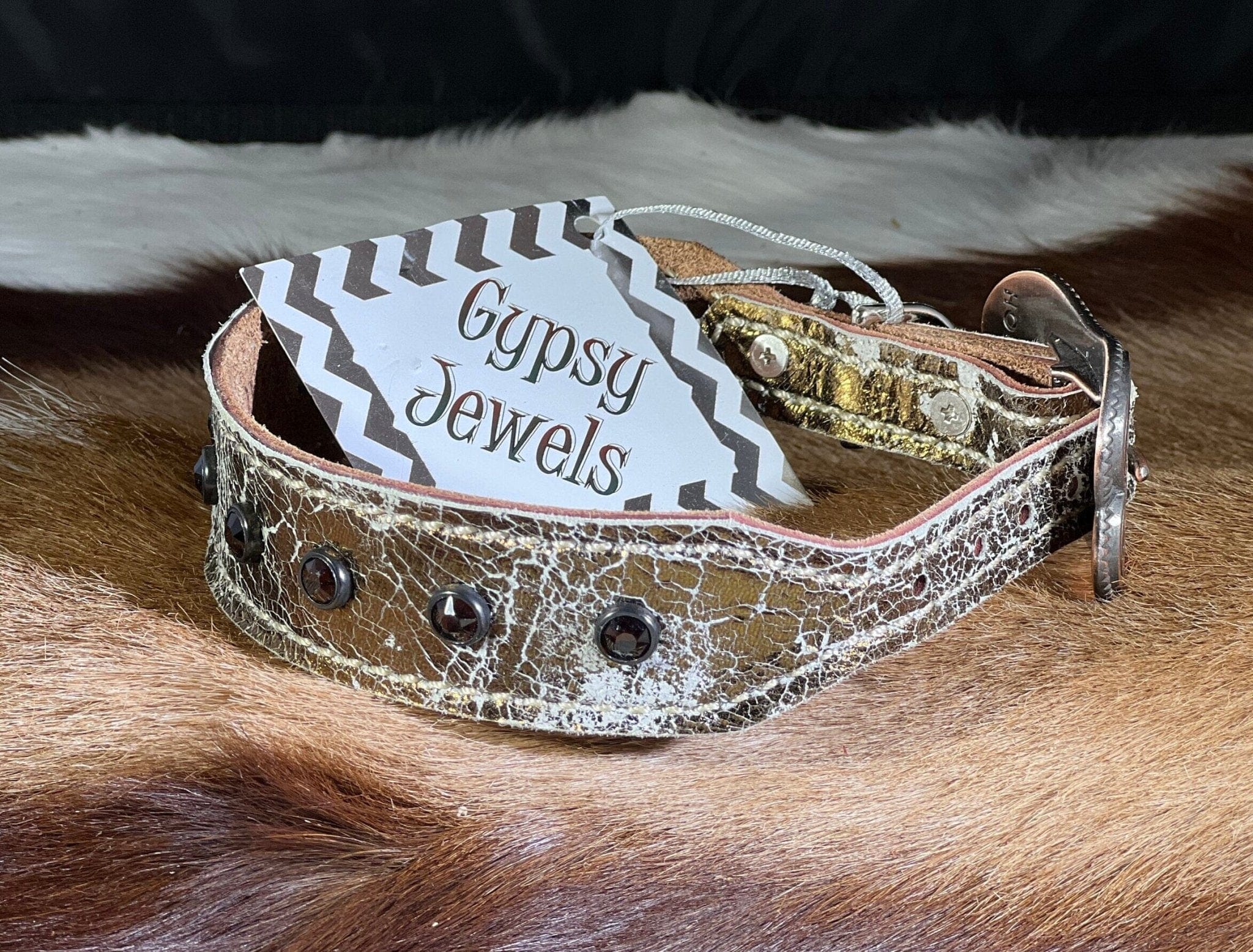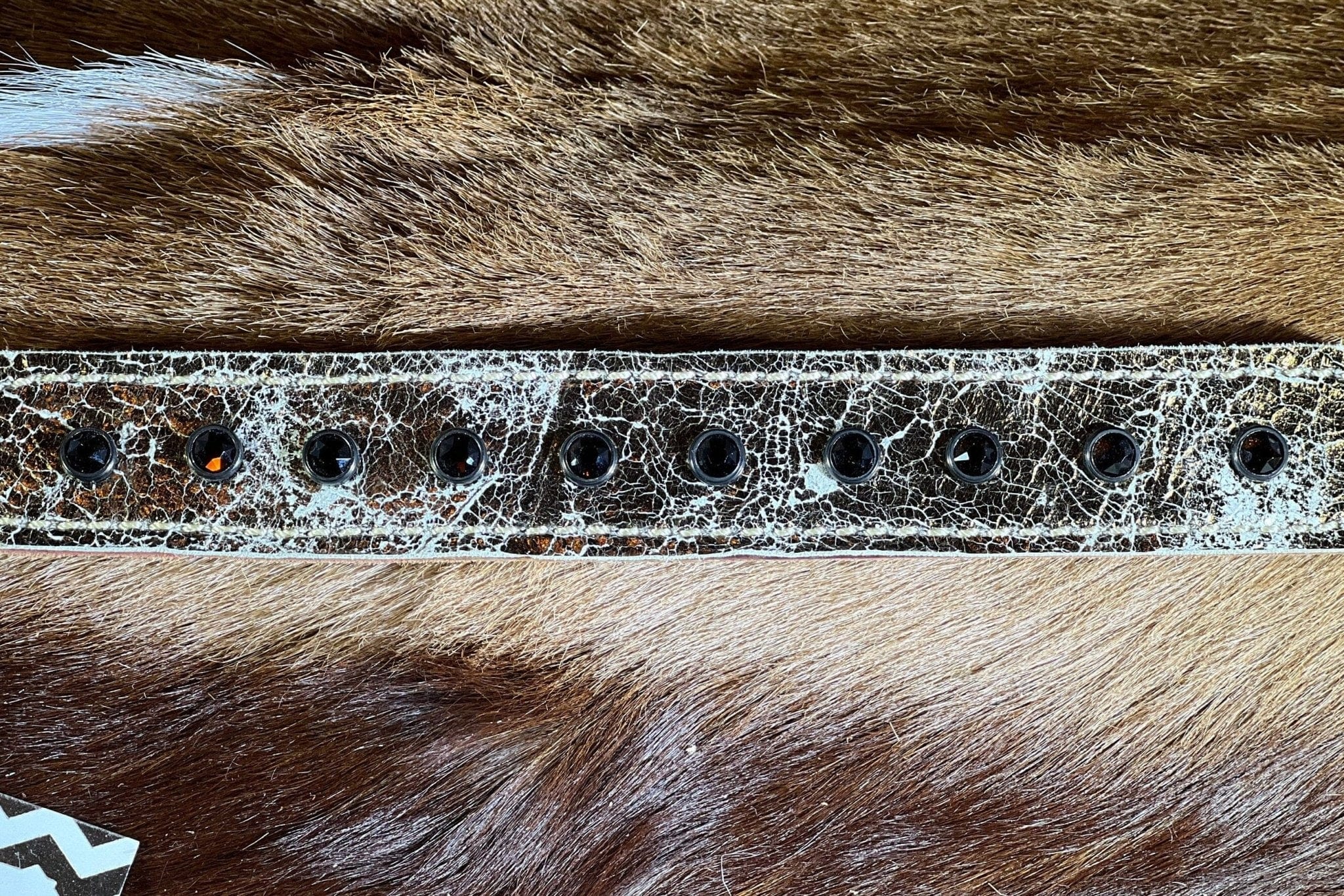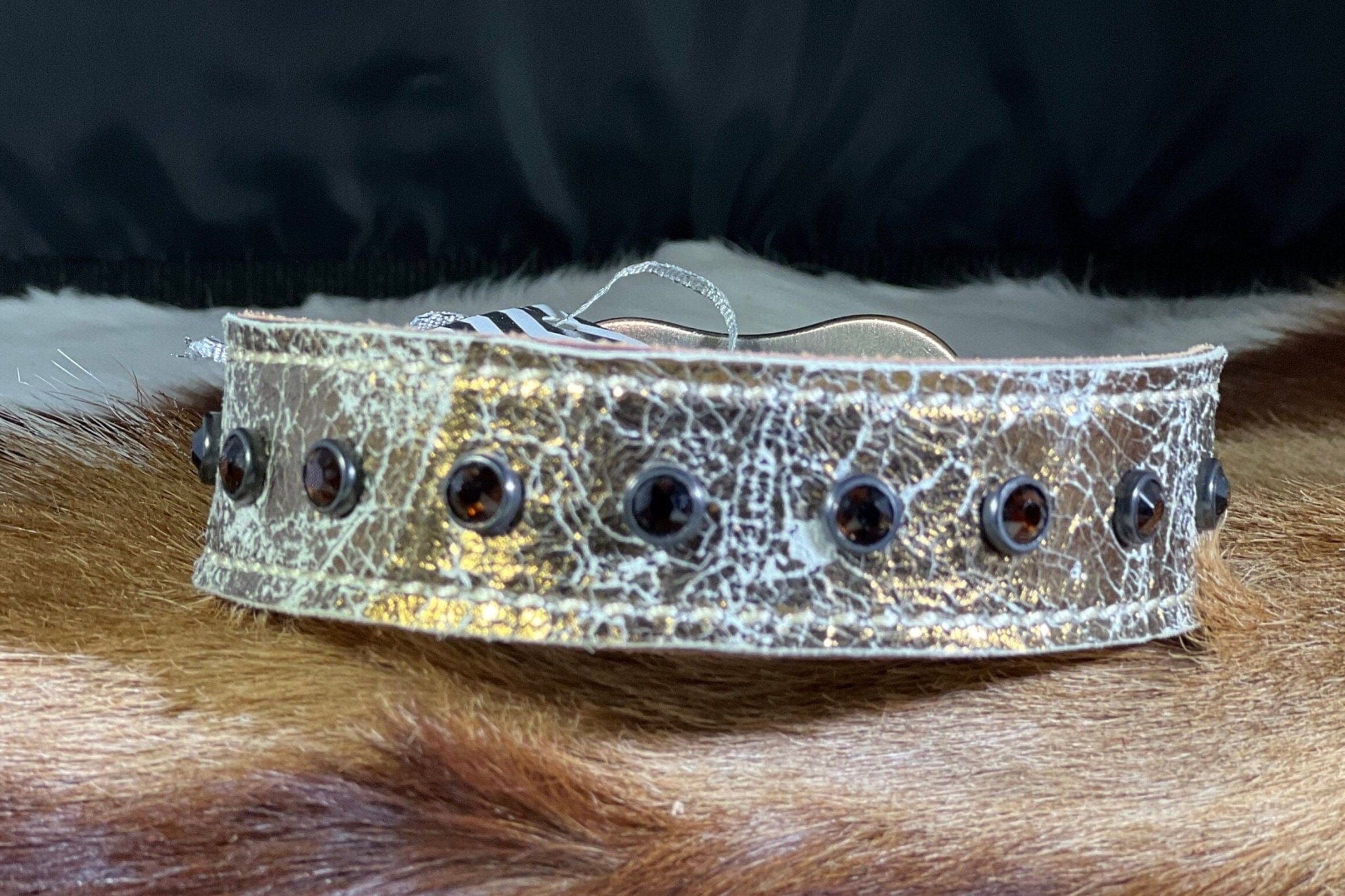Handcrafted from premium crackled gold leather, this Crackled GOLD Dog Collar exudes elegance and sophistication. Each Crackled GOLD Dog Collar is meticulously adorned with sparkling mocha-colored Swarovski Crystals, catching the light with every wag of the tail. Crackled GOLD Dog Collar is perfect for pups who love to strut their stuff, this Crackled GOLD Dog Collar adds a touch of glamour to daily walks and special occasions alike.