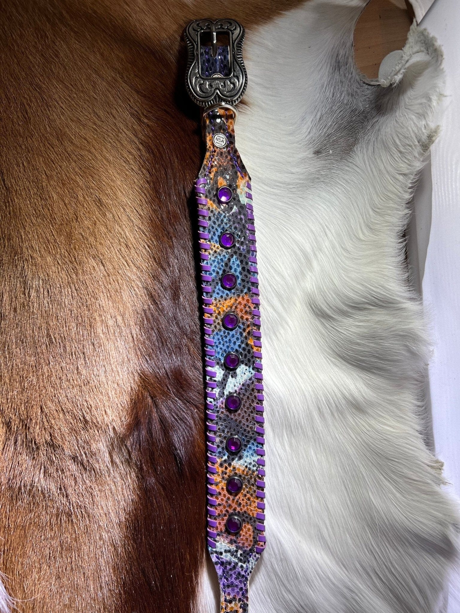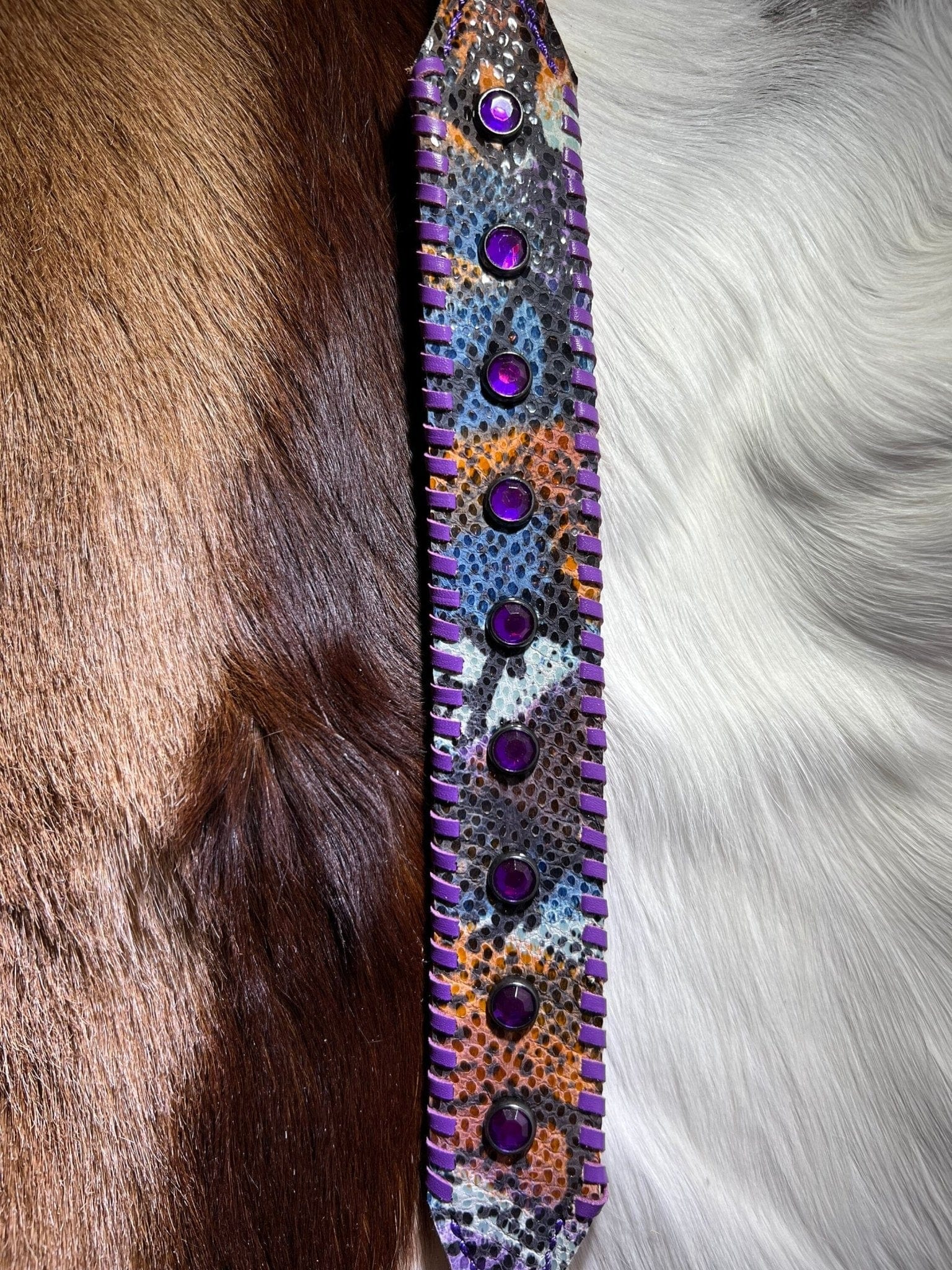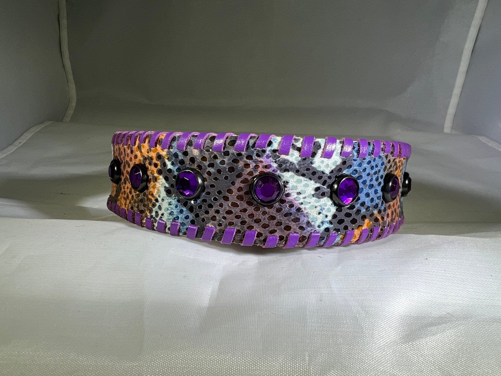 Wild style meets unmatched elegance! Perfect for the diva dog who loves to make a statement, this snakeskin dog collar is crafted from super soft embossed snakeskin leather that feels luxurious against your pup's neck. Adding to the glam, this stunning Snakeskin Dog Collar is adorned with exquisite violet purple whip stitching that frames the design beautifully, creating a seamless blend of bold and chic. And the PIECE de RESISTANCE? Sparkly Swarovski Crystals that glisten with every move.