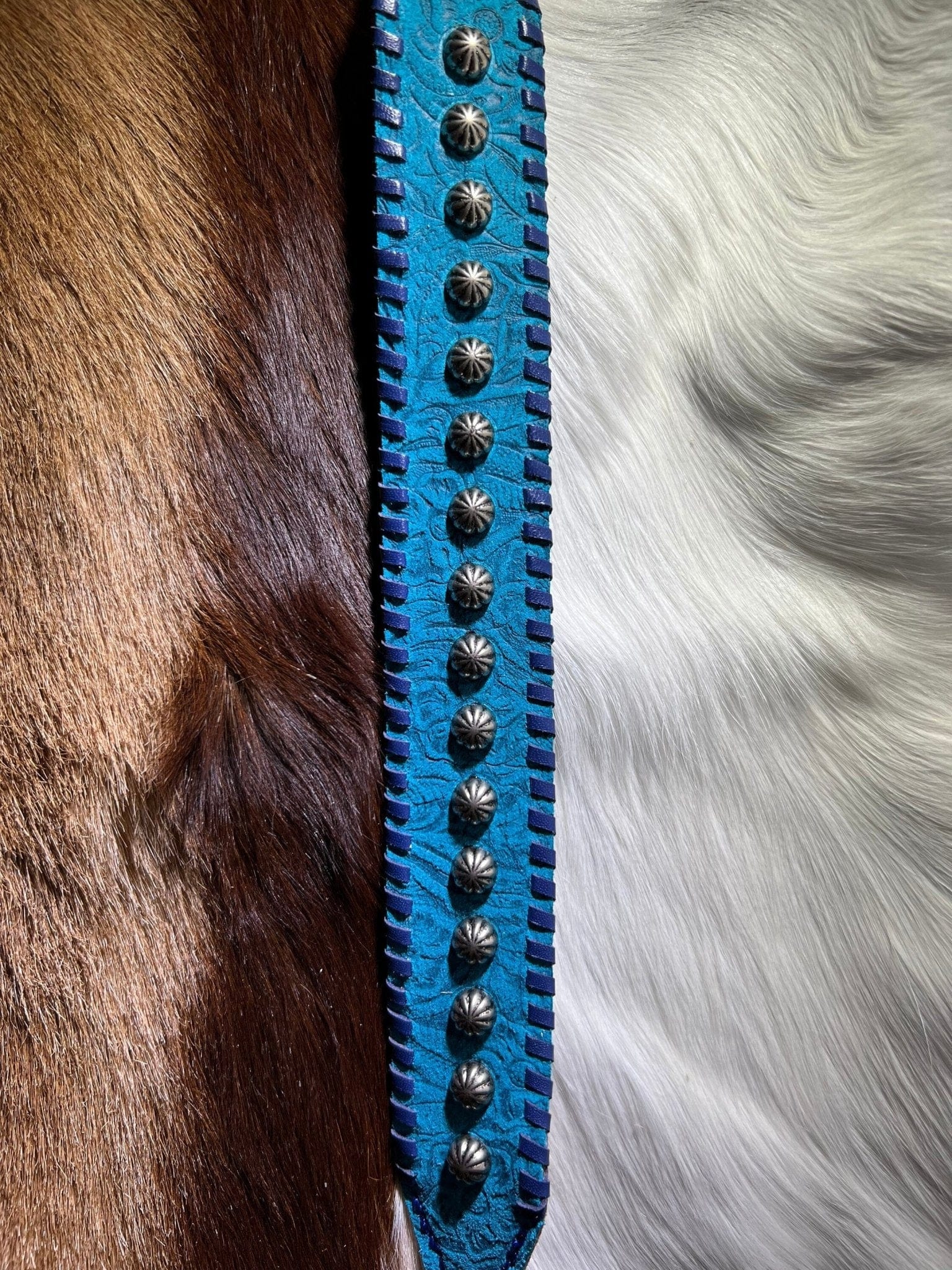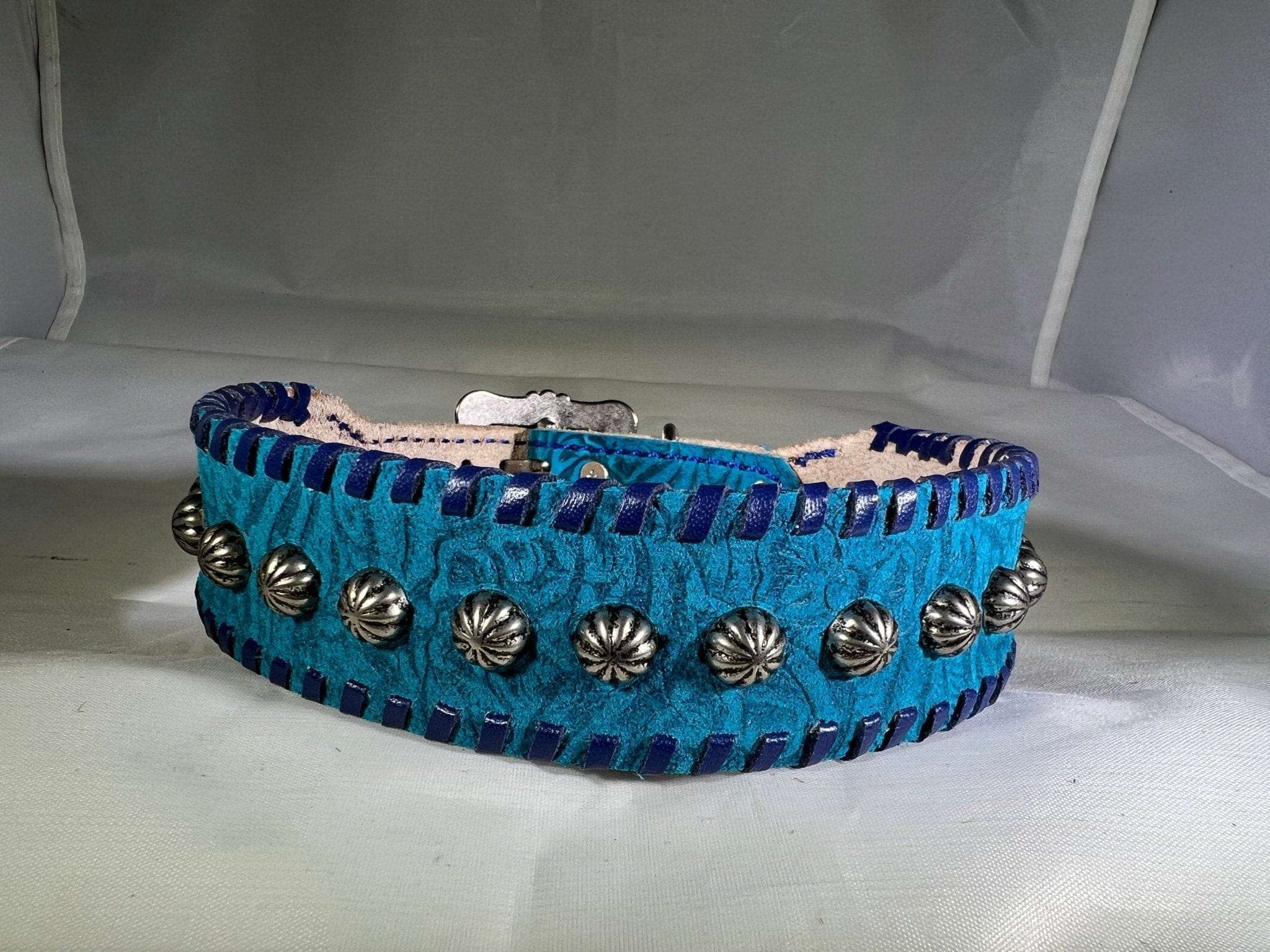 Bold color meets classic western craftsmanship. This handcrafted leather dog collar features a vibrant turquoise finish with a beautifully textured, floral embossed surface that gives it depth and character. Polished silver umbrella spots run the length of the collar, adding timeless western flair, while deep blueberry colored kangaroo lacing frames the edges for a striking, high-contrast look.