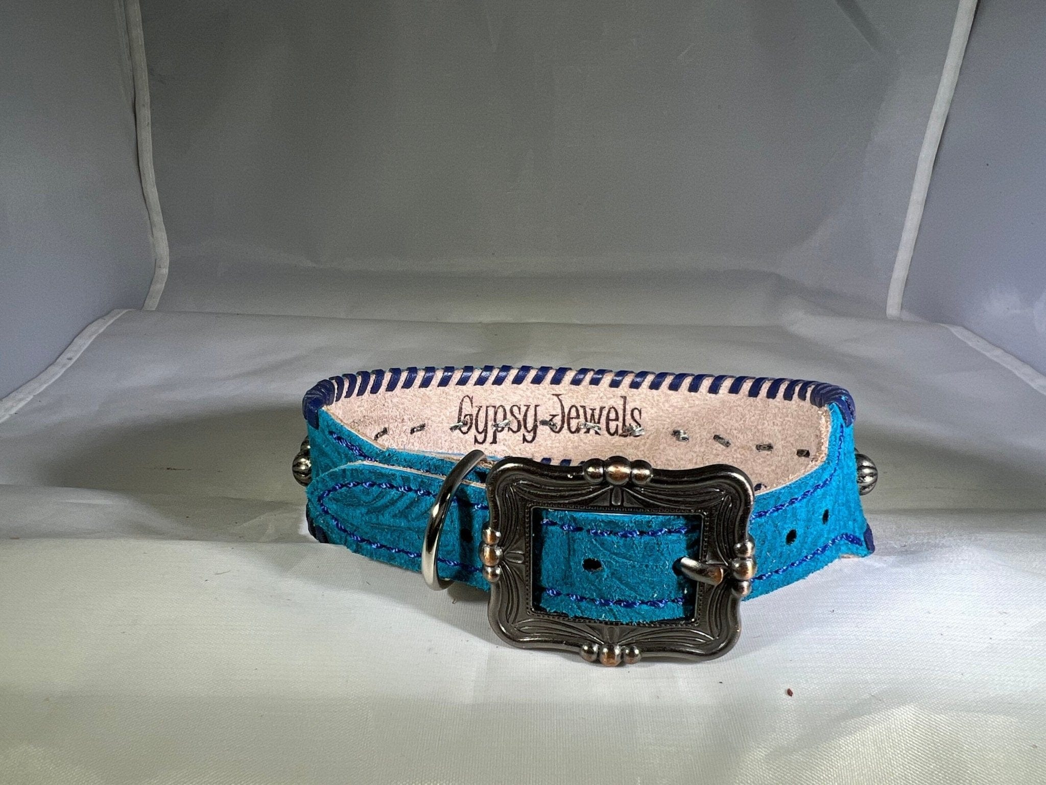 - The collar is further enhanced with 3/8" antique silver umbrella spots, each adding a touch of classic charm and sophistication. These antique silver accents provide a stunning contrast to the vivid blue, creating a look that is both striking and refined.